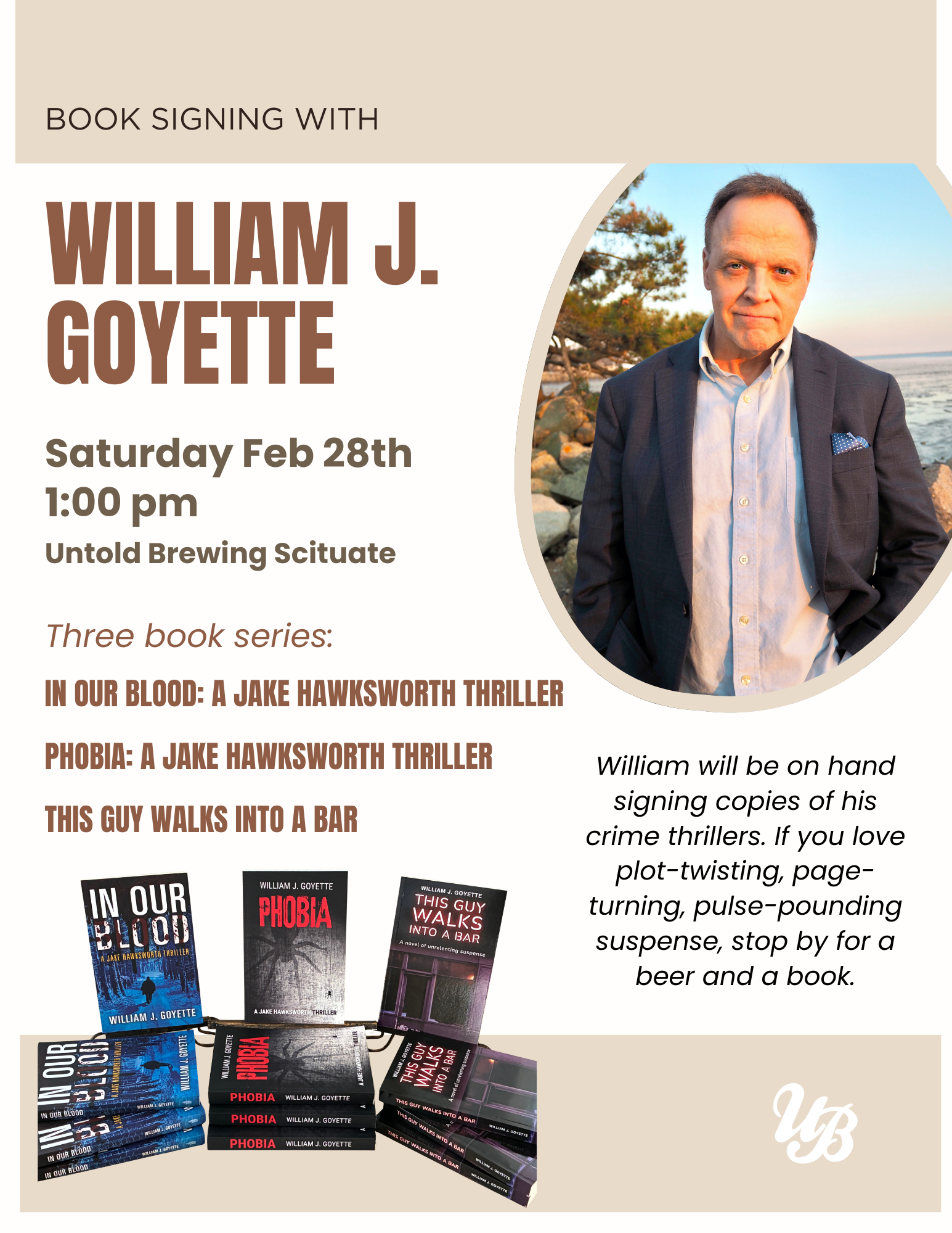 Join us at Untold Brewing in Scituate on Saturday, February 28 at 1 PM for an afternoon of craft beer and crime fiction with local author William J. Goyette.